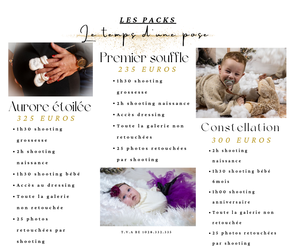 Voici un aperçu de mes tarifs. N'hésitez pas à me contacter pour une offre personnalisée. Mes prix sont compétitifs et incluent la galerie complète non retouchée, un avantage unique par rapport à d'autres photographes de la région.